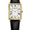 Dit vergulde Toccata herenhorloge is uitgerust met een quartz-uurwerk en heeft een slanke rechthoekige kast van roestvrij staal met een datumvenster op 3 uur, een verfijnde witte wijzerplaat met zwarte Romeinse cijfers en een zwarte band van echt kalfsleer voor een vleugje warmte bij deze moderne klassieker.